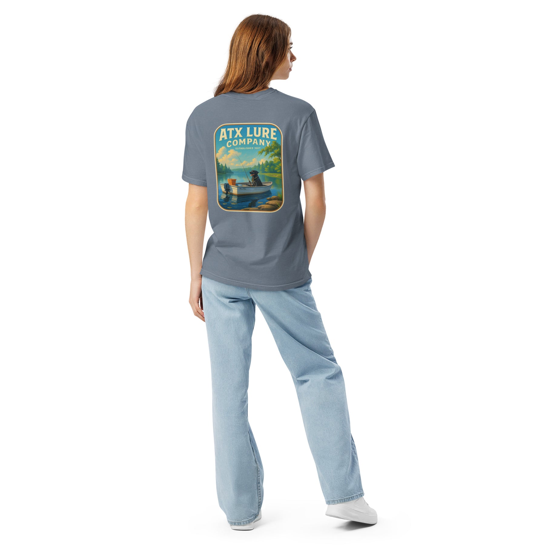 Very comfortable comfort colors shirt. Not tight around the neck like a lot of shirts. I love the print of the dog in the boat. Reminds me of fishing with my dog. Great shirt!